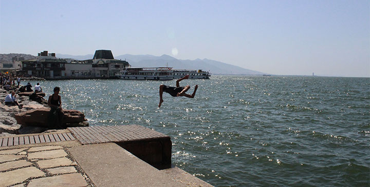 İzmir'de, 20 Nisan 1950 tarihinde 32,5 dereceyi gösteren termometre, tam 66 yıl sonra bugün 31 dereceyi buldu. Mevsim normallerinin 10 derece üstünde seyreden hava sıcaklığı nedeniyle vatandaşlar güneşli havanın tadını çıkardı, çocuklar Kordon'da denize girdi.