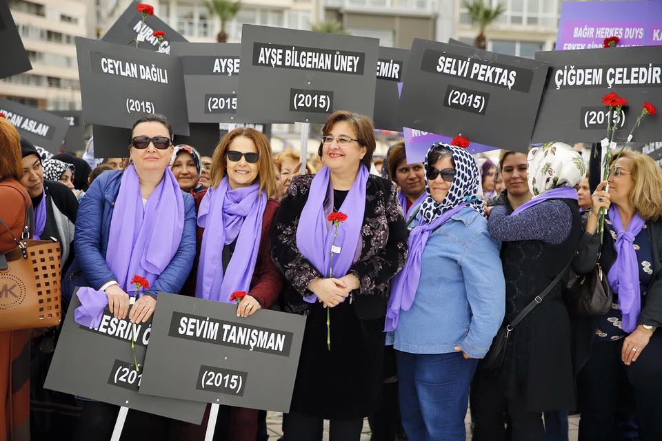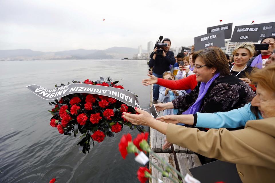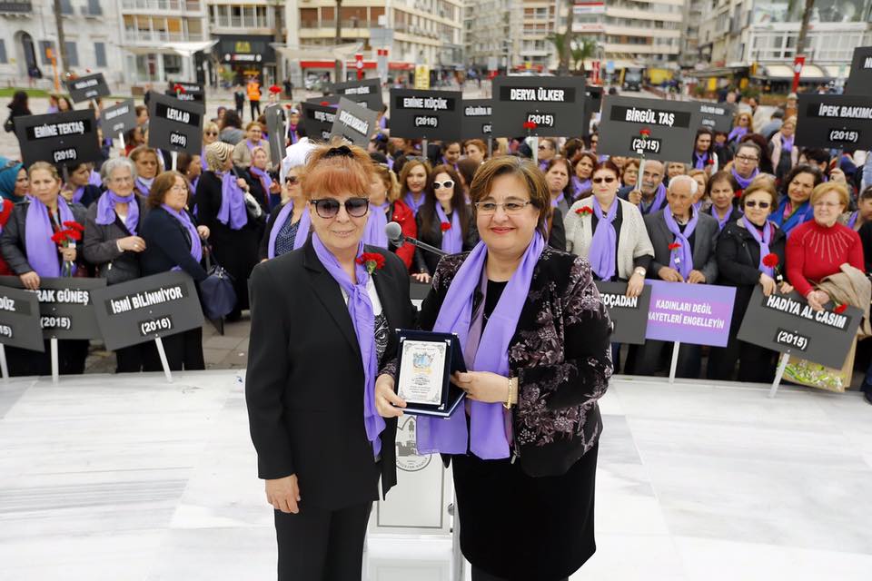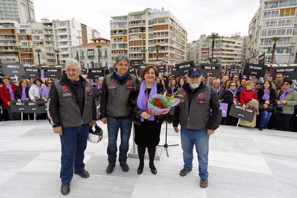 Konak Belediye Başkanı Sema Pekdaş’ın da yer aldığı etkinlikte mor fularları ve ellerindeki kırmızı karanfillerle hayattın her alanında olduğu gibi Gündoğdu Meydanı’na da renk katan kadınlar, öldürülen kız kardeşleri için denize siyah çelenk bıraktı.