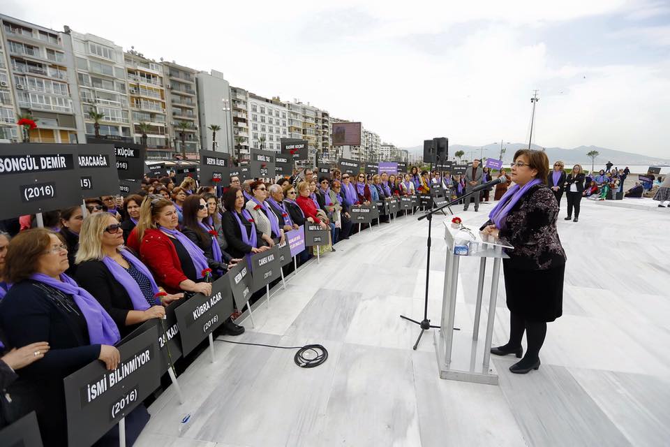 İzmir’in kalbi Konak 8 Mart Dünya Kadınlar Günü’nde anlamlı bir etkinliğe ev sahipliği yaptı. Konak Belediyesi’nce düzenlenen etkinlik kapsamında genç yaşlı, çalışan çalışmayan, anne olan olmayan yüzlerce kadın Alsancak Gündoğu Meydanı’nda buluşarak özgürlük, eşitlik ve emek uğruna öldürülen ya da erkek terörüne kurban edilen hemcinslerini andı.