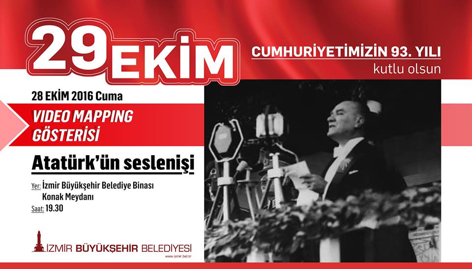 Cumhuriyetin 93. yıldönümünü kutlama etkinlikleri kapsamında İzmir, eşine az rastlanan bir gösteriye sahne olacak. 28 Ekim Cuma akşamı İzmir Büyükşehir Belediyesi'nin Konak'taki hizmet binası dev bir perdeye dönüşecek. Işık, ses ve görüntü efektlerinden oluşan özel video mapping gösterisiyle Atatürk, İzmirlilere seslenecek. Saat 19.30'da başlayacak gösteri Varyant gibi kentin Konak Meydanı'nı kuşbakışı gören noktalarından da izlenebilecek.