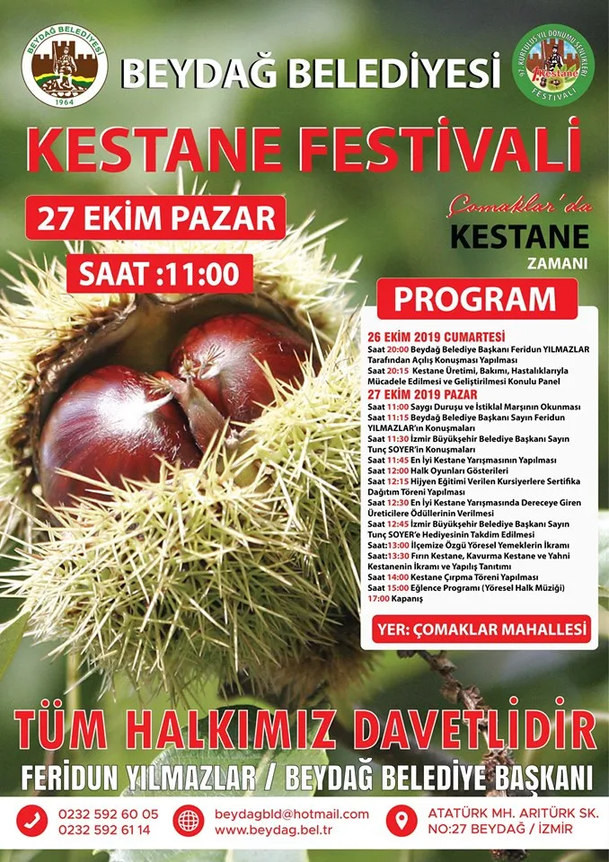 Beydağ Belediyesi Tarafından 1. si düzenlenen Kestane Festivali 26 – 27 Ekim 2019 tarihinde sizlerle…