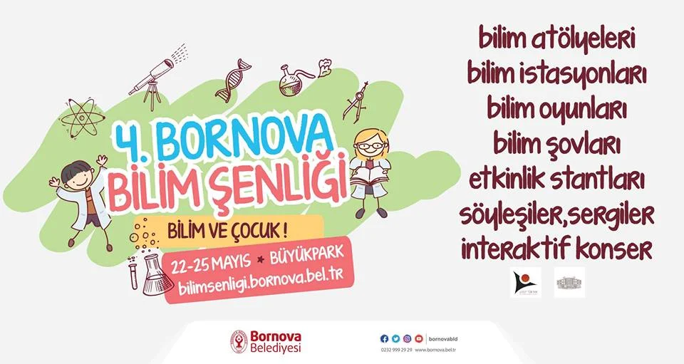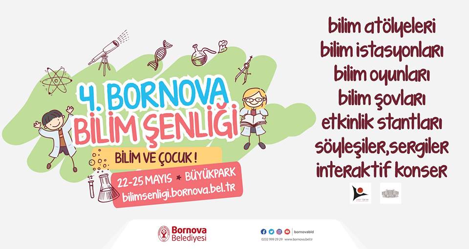 Bu yıl dördüncüsünü düzenleyeceğimiz IV. Bornova Bilim Şenliği 22-25 Mayıs 2019 tarihleri arasında Bornova Büyük Parkta, 4 gün boyunca Bilim ve Çocuk sloganıyla gerçekleşecek. Birbirinden farklı atölyeler, bilim istasyonları, bilim temalı oyunlar, bilim şovları sizleri bekliyor… Bu Bilim Şenliği 4007 TÜBİTAK Bilim Şenlikleri Destekleme Programı tarafından desteklenmektedir ve proje yürütücüsü olan Bornova Belediyesi tarafından da organize edilmektedir. Tüm etkinliklere katılım ücretsizdir.
