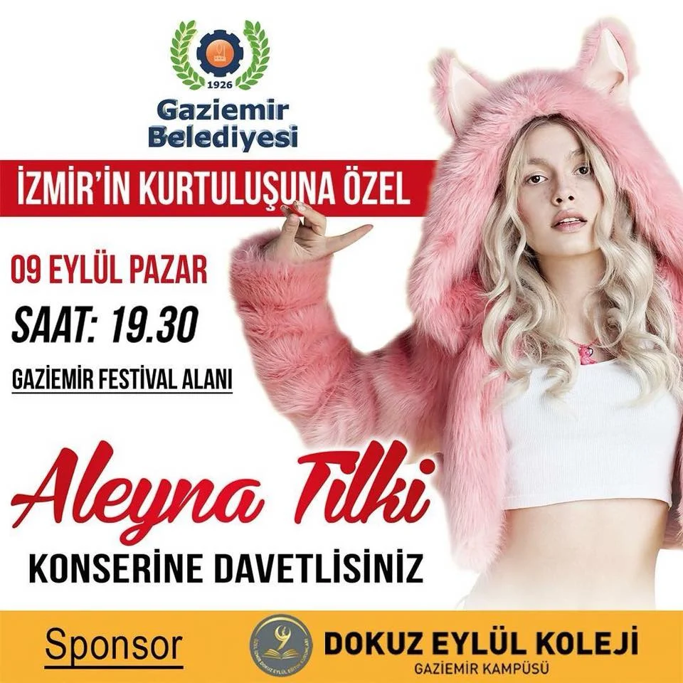 İzmir’in kurtuluşuna özel düzenlenen Aleyna Tilki konserine tüm halkımız davetlidir.Tarih: 9 Eylül PazarYer: Gaziemir Festival AlanıSaat: 19:30
