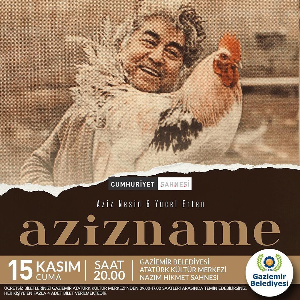 “Azizname” isimli tiyatro oyunu, 15 Kasım Cuma günü saat 20:00’de Gaziemir Atatürk Kültür Merkezi’nde sahnelenecektir.