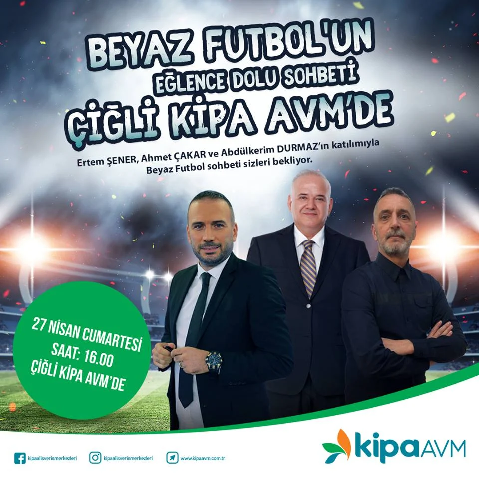 Futbolseverler haydi Kipa AVM'ye! Ertem Şener, Ahmet Çakar, Abdülkerim Durmaz ile Beyaz Futbol'un eğlenceli sohbeti 27 Nisan saat 16.00'da Çiğli Kipa AVM'de sizlerle buluşuyor.