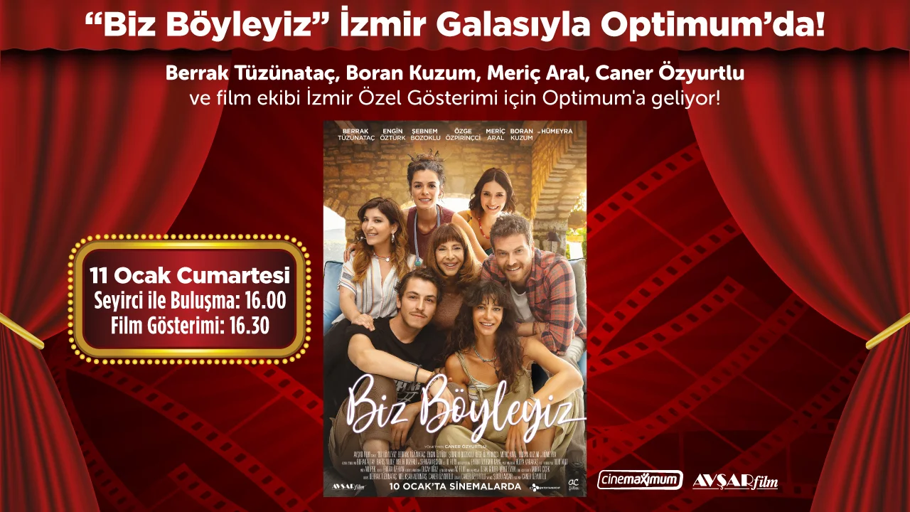 Tarih: 11 Ocak 2020Saat: 16.00Yer: Optimum AVMBiz Böyleyiz Film Ekibi İzmir Özel Gösterimi İçin Optimum'a Geliyor!Seyirciyle Buluşma: 16.00Film Gösterimi: 16.30