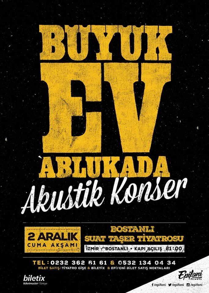 Büyük Ev Ablukada – Akustik2 Ara 2016 Cum 21:00Bostanlı Suat Taşer TiyatrosuBilet Fiyatları1. Kategori – 55.00 TL2. Kategori – 44.00 TL