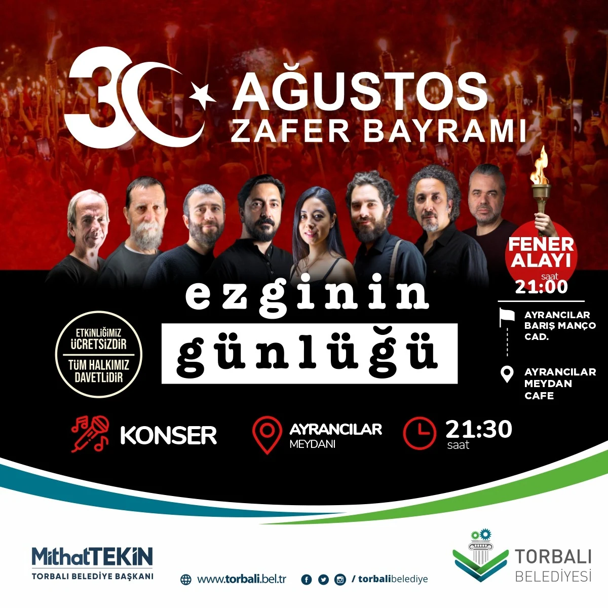 30 Ağustos Zafer Bayramını coşkuyla kutluyoruz. Zafer Bayramının 99. yılı dolayısıyla Ayrancılar’da saat 21.00’da fener alayı, saat 21.30’de Ezginin Günlüğü konserinde buluşuyoruz. Bu coşkuya ortak olmak isteyen tüm hemşehrilerimizi etkinliğe davet ediyoruz.