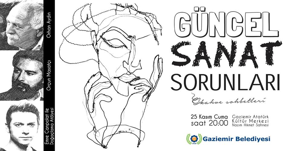 25 Kasım 2016 Saat:20.00'da Gaziemir Atatürk Kültür Merkezinde Gerçekleştirilecek Olan ‘Kahve Sohbetleri’ Güncel Sanat Sorunları Söyleşisinde Orhan Aydın, Orçun Masatçı ve Emre Canpolatın Konuk Sanatçı Olarak Katılacağı Söyleşimize ve Doğaçlama Atölyesine Tüm Halkımız Davetlidir.