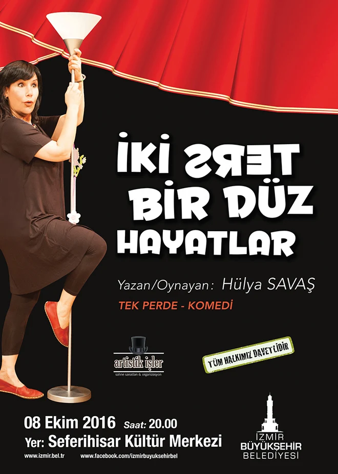 Hülya Savaş'ın yazdığı ve oynadığı ''İki Ters Bir Düz Hayatlar'' 8 Ekim Seferhisar Kültür Merkezi'nde sahneleniyor.