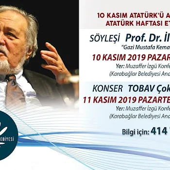 SÖYLEŞİProf. Dr. İlber ORTAYLI‘Gazi Mustafa Kemal ATATÜRK’10 Kasım 2019 Pazar // Saat: 17:00Muzaffer İzgü Konferans SalonuKarabağlar Belediyesi Ana Hizmet Binası