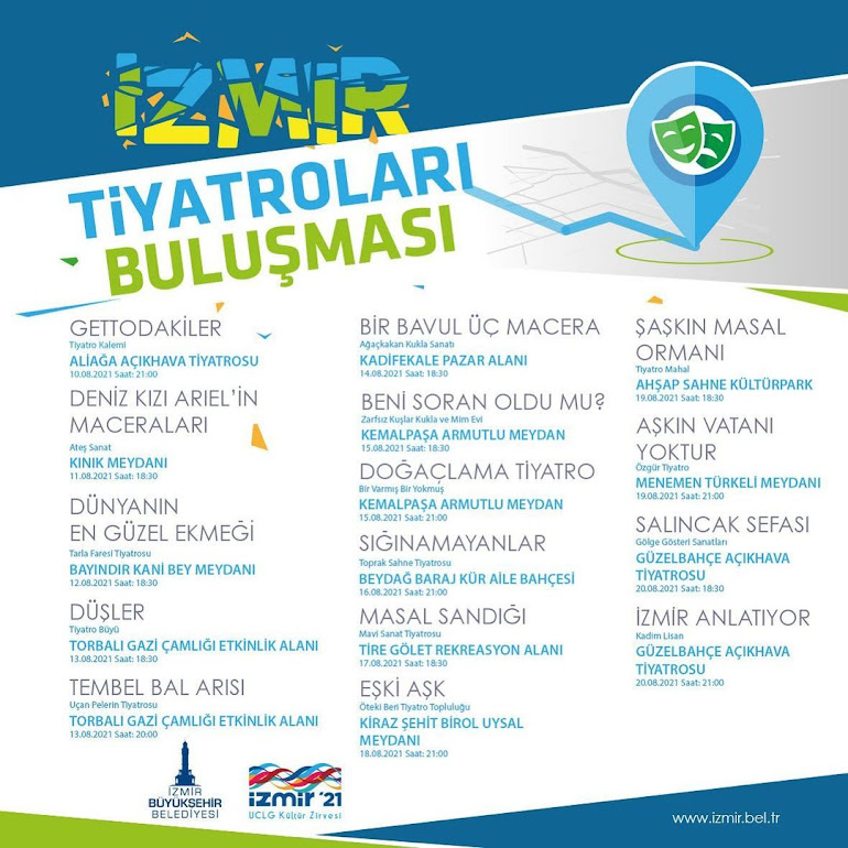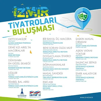 İzmir Büyükşehir Belediyesi 11 ayrı ilçede İzmirli 21 tiyatro ekibini tiyatro severlerle buluşturuyor. İzmir Tiyatroları Buluşması kapsamında 15 oyun 10-20 Ağustos tarihleri arasında sahnelenecek. Aliağa, Kınık, Bayındır, Torbalı, Konak, Kemalpaşa, Beydağ, Tire, Kiraz, Menemen ve Güzelbahçe’de oynanacak oyunların ilk gösterimi “Gettodakiler” saat 21.00’de Aliağa Açıkhava Tiyatrosu’nda sahnelenecek.