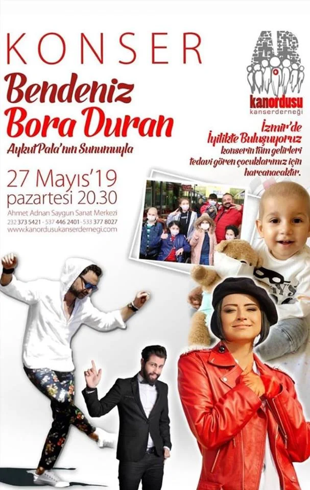 Ahmed Adnan Saygun Sanat Merkezi’nde, 27 Mayıs Pazartesi günü, Aykut Pala’nın sunumuyla gerçekleşecek konserde Bendeniz ve Bora Duran sahne alacak. “İzmir’de iyilikte buluşuyoruz” sloganıyla düzenlenen konsere bilet almak isteyenler 232 373 54 21 ve 533 377 80 27 numaralı telefonlara başvurabilir. www.kanordusukanserdernegi.com sitesinde de etkinliğin detaylarına ulaşılabilir.