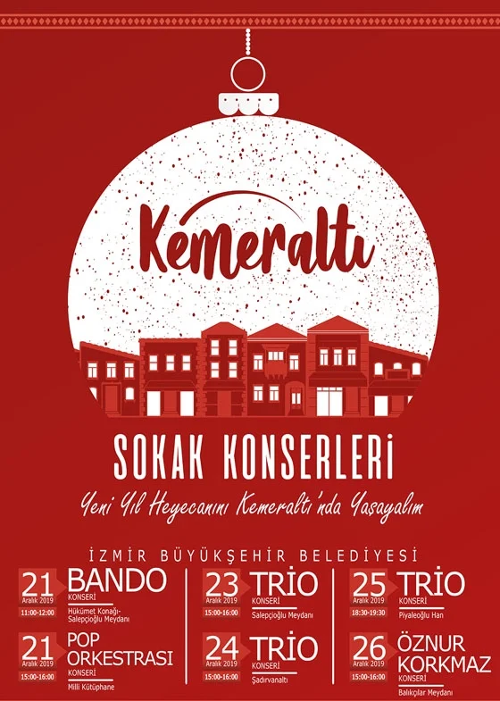 Kemeraltı`nda yılbaşı etkinlikleri kapsamında 21 – 23 – 24 – 25 ve 26 Aralık 2019 tarihlerinde bir dizi sokak konseri var.