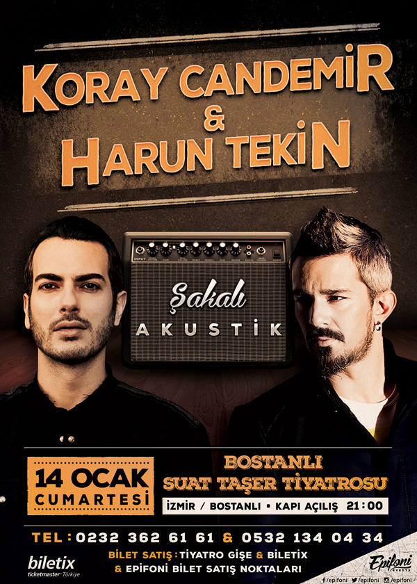 Koray Candemir – Harun Tekin Şakalı Akustik14 Oca 2017 Cmt 21:00Bostanlı Suat Taşer TiyatrosuBilet Fiyatları1. Kategori – 55.00 TL2. Kategori – 44.00 TL