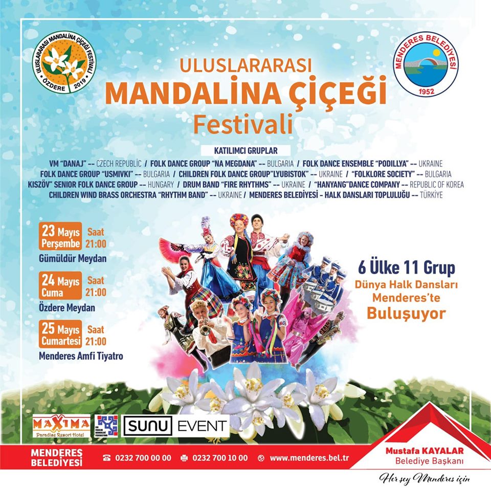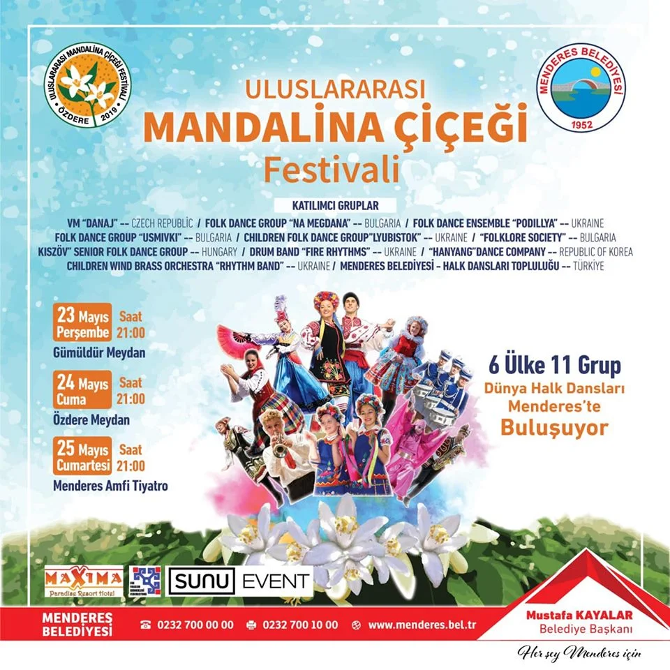 Menderes Belediyesi ev sahipliğinde, Sunu Event Organizasyon, Ege Folklor Dernekleri Federasyonu ve Maxima Otel’in katkılarıyla düzenlenecek 1. Uluslararası Mandalina Çiçeği Festivali için geri sayım başladı. 22-25 Mayıs tarihlerinde Menderes’te ki etkinlikte dünya halk danslarının en güzel örnekleri sergilenecek.