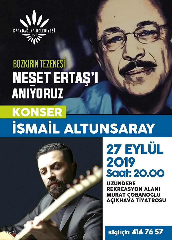 Neşet ERTAŞ'ı Anıyoruz27 Eylül 2019 20:00Uzundere Rekreasyon AlanıBozkırın Tezenesi Neşet ERTAŞ'ı anma etkinliğimize tüm halkımız davetlidir.