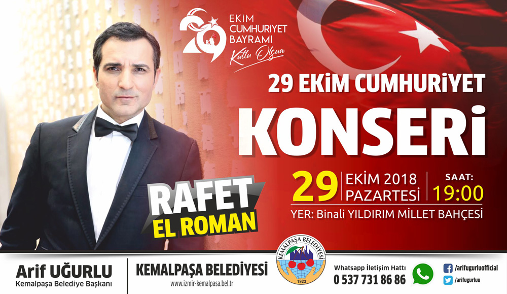 Ünlü sanatçı Rafet El Roman'ın birbirinden güzel şarkılarını seslendireceği konser ile Kemalpaşalılar ve İzmirliler Cumhuriyet Bayramı coşkusunu dolu dolu yaşayacak.