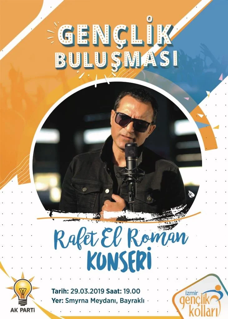 AK Parti İzmir İl Gençlik Kolları, İzmirli gençleri ünlü sanatçı Rafet El Roman ile buluşturacak. Bayraklı Smyrna Meydanı’nda gerçekleştirilecek ve saat 19.00’da başlayacak “Gençlik Buluşması”, renkli görüntülere sahne olacak. Sevilen şarkılarını İzmirli gençler için söyleyecek olan Rafet El Roman, alanı dolduranlara unutulmaz bir akşam yaşatacak. Programa, Cumhur İttifakı AK Parti İzmir Büyükşehir Belediye Başkan Adayı Nihat Zeybekci de katılacak.