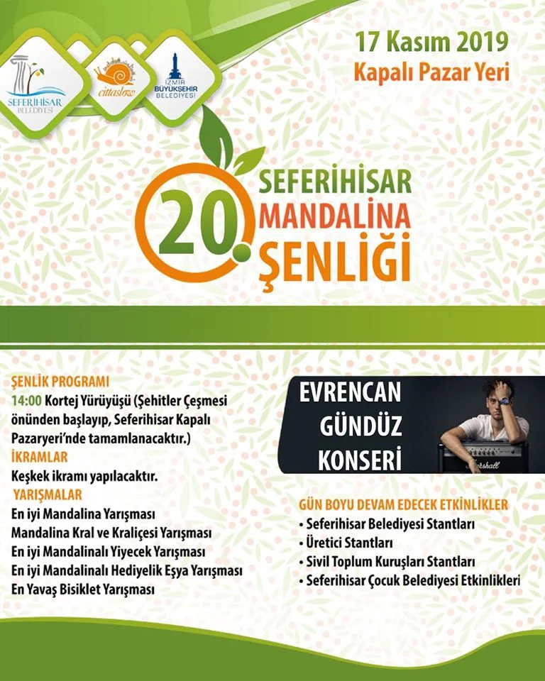 İzmir Seferihisar Belediyesi tarafından, Seferihisar mandalinasının tanıtımı için düzenlenen Seferihisar Mandalina Şenliği, bu yıl 20. kez yapılacak. 17 Kasım 2019 Pazar günü gerçekleşecek festival, Seferihisar Çarşı Meydanı’nda, saat 12.00 ile 23.00 arasında yapılacak. Seferihisar Çarşısı’nda kurulacak stantlarda çeşitli dans gösterileri ve etkinlikler gerçekleşecek.