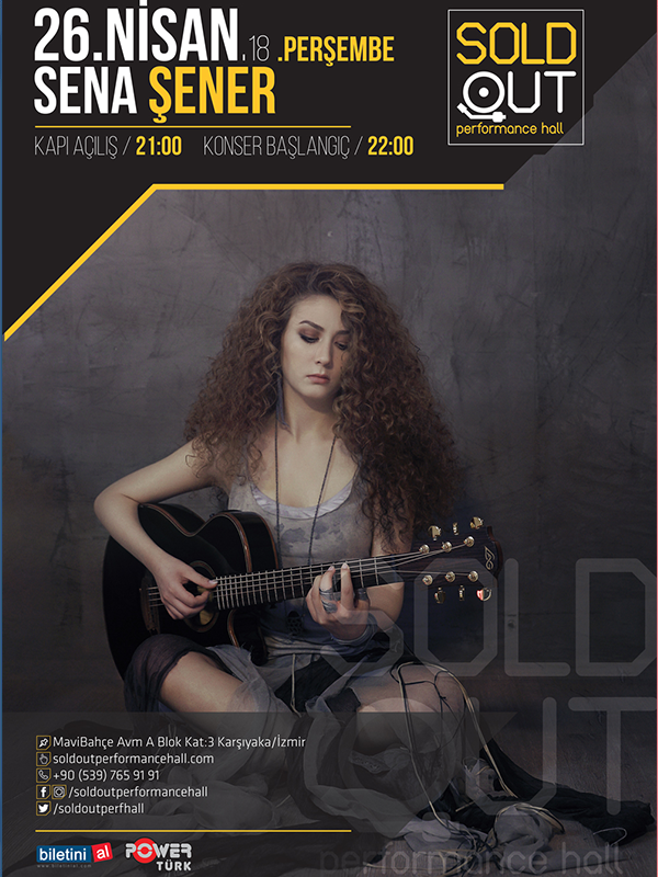 ‘Sena Şener’ Konseri26 Nisan Perşembe – 22:00 SoldOut Performance Hall Biletler45,00 TL30,00 TLGenç yetenek Sena Şener, İzmir SoldOut Performance Hall sahnesinde sevenleriyle buluşmaya hazırlanıyor.