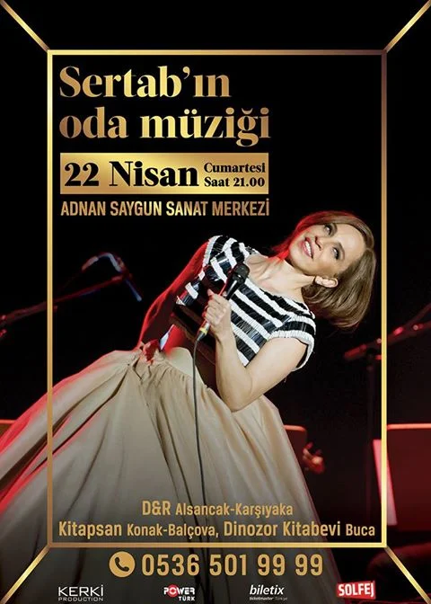 Sertab'ın Oda Müziği22 Nisan 2017, Cumartesi, 21:00 Ahmed Adnan Saygun Sanat MerkeziBiletler1. Kategori – 165.00 TL2. Kategori – 132.00 TLGüçlü sesi ve harika performansıyla Sertab Erener, ‘Sertab'ın Oda Müziği’ projesi ile Ahmet Adnan Saygun Sanat Merkezi'nde….