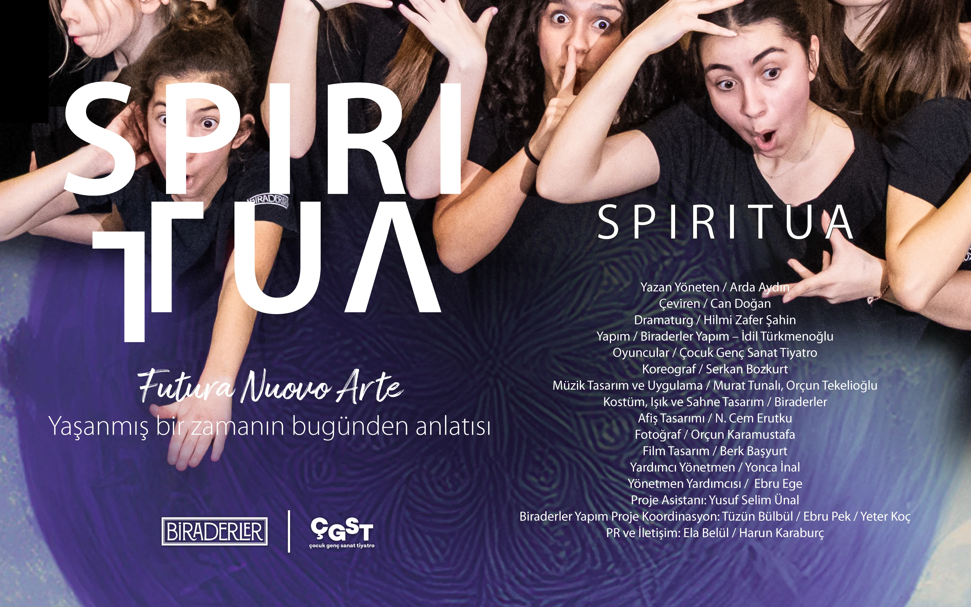 William Shakespeare’in tiyatro literatürünü adeta tanımlayan beş tragedyasını, Hamlet, Macbeth, Othello, Kral Lear ve 3. Richard oyunlarının hikayelerini 45 çocuk ve gencin ağzından duyuyoruz. Truva Savaşı’nı bu kocaman ekipten dinliyoruz. Savaşın yıkıcılığını, insan tarihinin dönüm noktalarını onların dansları ve muhteşem koreografilerle izliyoruz. Çok sevilen popüler şarkıların eşliğinde olağanüstü hareketli sahne koreografisini izlerken bir yandan Barış Manço\’nun Dönence ’sini 45 kişilik korodan, onların yorumuyla dinliyoruz. Kısacası adeta alev almış bir sahnede, sahnelemenin yeni neslini seyirciye sunuyoruz. Spiritua ile yepyeni bir sahneleme biçiminin ruhunu yeni nesille beraber seyirciye ve Türk Tiyatrosu’na üflüyoruz. Spiritua, çocuk ve gençlerin sınırları yıkmasının hikayesi…