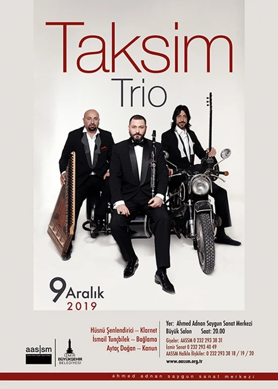 Klarnet, bağlama ve kanunun sıradışı birlikteliği Ahmed Adnan Saygun Sanat Merkezi'nde müzikseverlerle buluşuyor! Özgün bestelerin yanı sıra repertuvarlarında Orhan Gencebay, Zülfü Livaneli ve Şükrü Tunar’ın parçalarına yer veren üçlü dünya müziğinin en önemli müzik fuarı WOMEX'te ayakta alkışlandı ve Londra Caz Festivali'nde sahne aldı. Enstrümanlarına tutkun Hüsnü Şenlendirici, İsmail Tunçbilek ve Aytaç Doğan'dan oluşan Taksim Trio, müzikal zenginlikleriyle dünya müziğinde son yılların en dikkat çekici gruplarından biri sayılıyor.