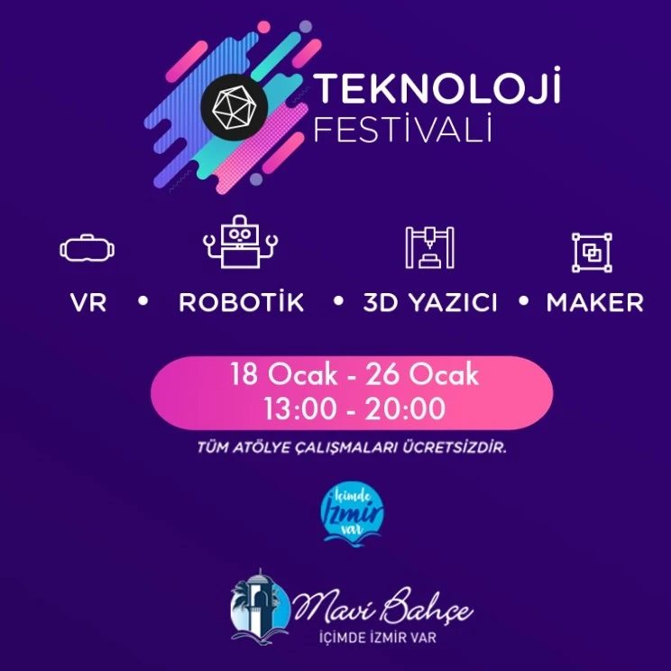 İzmir'in teknoloji buluşmasına çok az kaldı! Sanal gerçeklik konsept simülasyonlarından robot atölye çalışmalarına, 3 boyutlu yazıcı atölyelerinden beyin gücü ve konsantrasyon yarışlarına, 3 boyutlu baskı sergisinden maker çocuk atölye çalışmalarına kadar interaktif onlarca stant ve aktivite, MaviBahçe Teknoloji Festivali'nde olacak. Stant ve etkinlik çeşitliliğiyle her yaştan teknoloji meraklısına hem eğlenceli hem de ufuk açıcı anlar yaşatacak etkinliğimiz, 18-26 Ocak tarihleri arasında seni bekliyor.