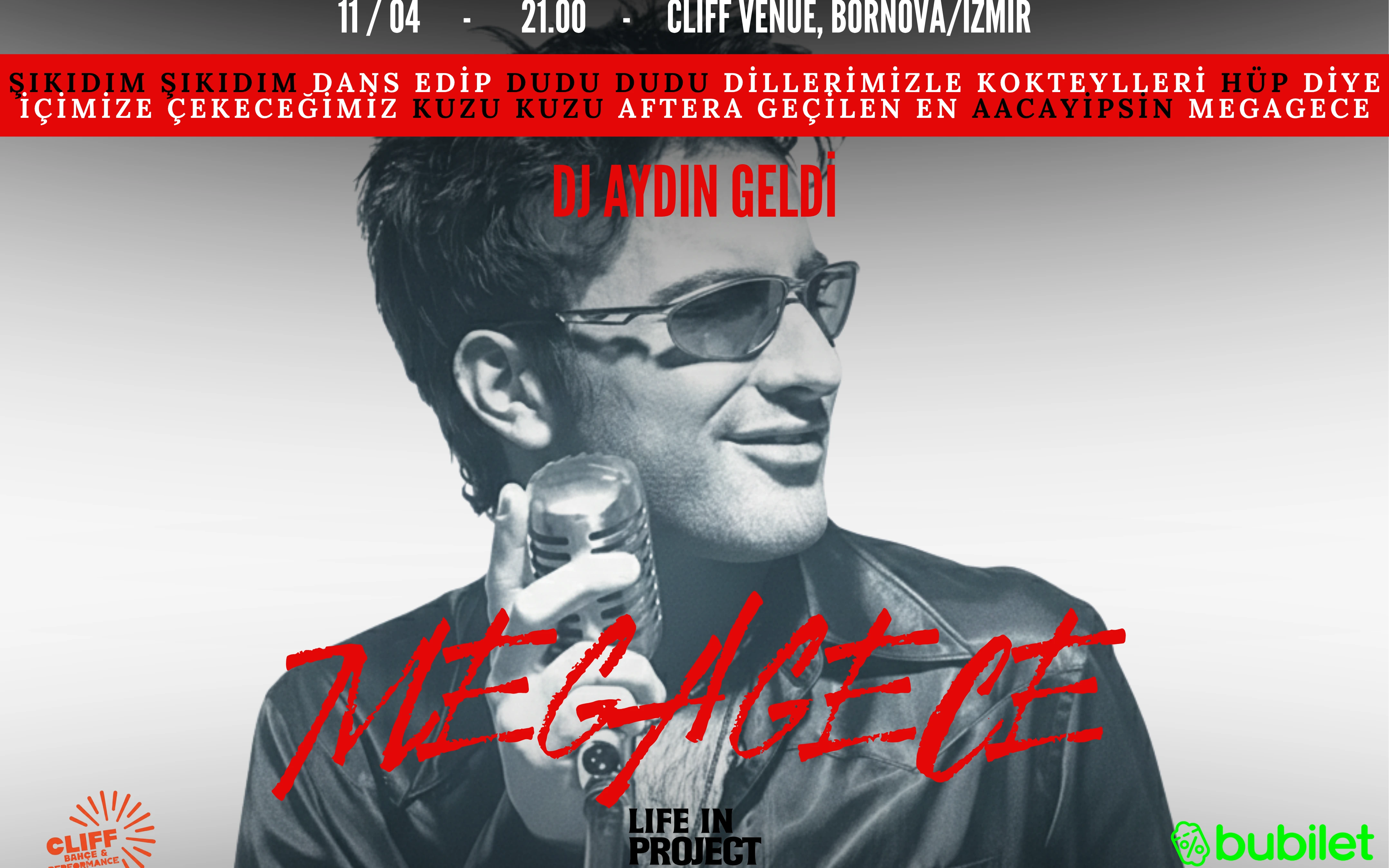 Megagece – İzmir 11 Nisan 2026, Cumartesi, 21:00 Cliff Venue 🪩 Tarkan konserine gidemedim diye üzülme.. “MEGAGECE “ seni bekliyor ! 🎧 Dj Aydın Geldi ‘nin eşsiz performansıyla müziğin ritmine kapılacaksınız!