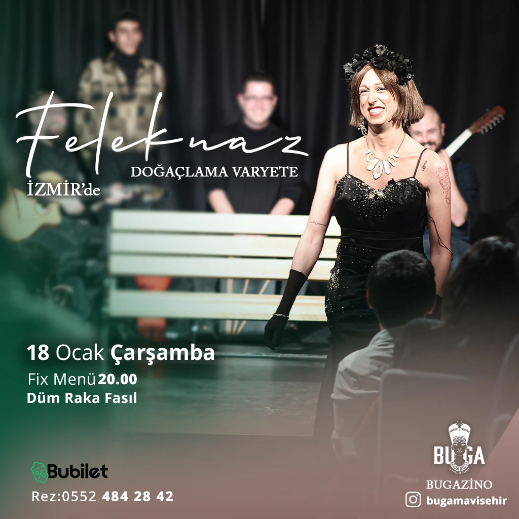 Kahpe Feleknaz Varyete Show & Fasıl 18 Ocak 2023, Çarşamba, 20:00 Buga Mavişehir BUGAZİNO gururla sunar… Fasıl eşliğinde ” KAHPE FELEKNAZ DOĞAÇLAMA VARYETE SHOW İzmir’de” Birebir