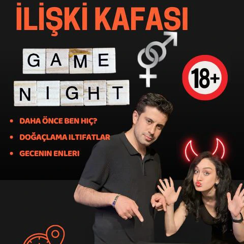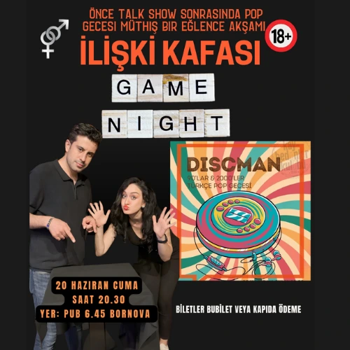 İlişki Kafası Game Night ve Türkçe Pop Gecesi 20 Haziran 2025, Cuma, 20:30 6:45 KK Bornova Harika bir akşam sizleri bekliyor. Önce kadın erkek ilişkilerinin karmaşasında kaybolup sonra doksanlar popun ritminde coşuyoruz . Önce