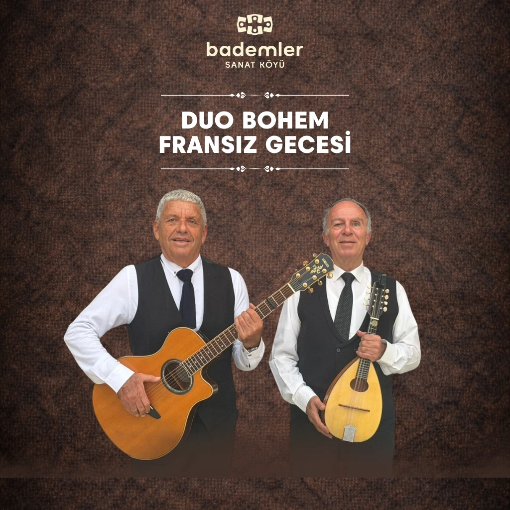 DUO BOHEM ‘FRANSIZ GECESİ’ 24 Nisan 2026, Cuma, 20:00 Bademler Sanat Köyü Duo Bohem ‘Fransız Gecesi’ Romantizmin, zarafetin ve müziğin başkenti Fransa’nın büyülü atmosferine davetlisiniz… Duo Bohem,