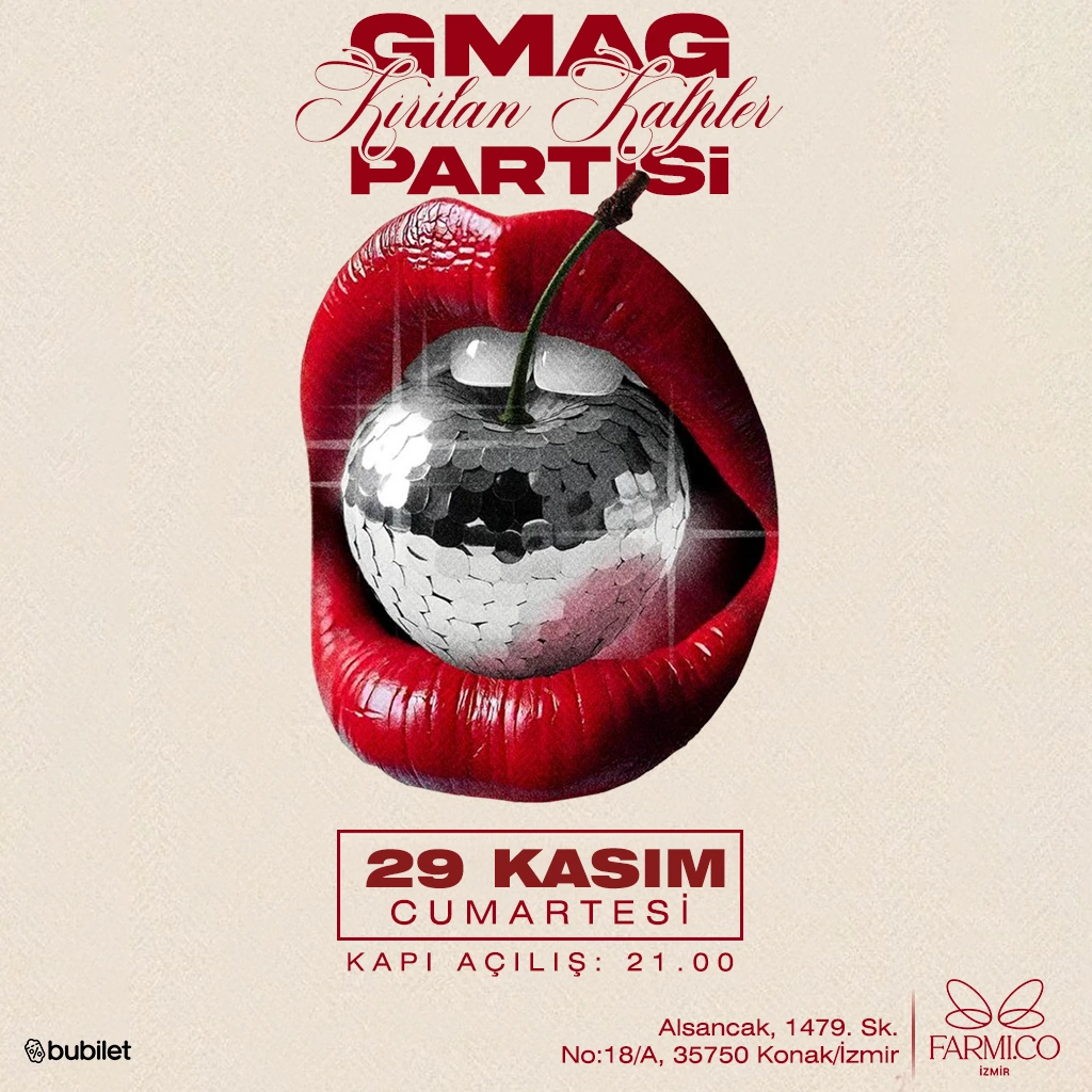 Gmag Özel İzmir Partisi 08 Kasım 2025, Cumartesi, 21:00 Farmi.co Gmag Özel İzmir Partisi  DJ performansları ve unutulmaz anlar seni bekliyor.Kırılan Kalpler için İzmir Özel Partisi, Gmag’le bir başka!