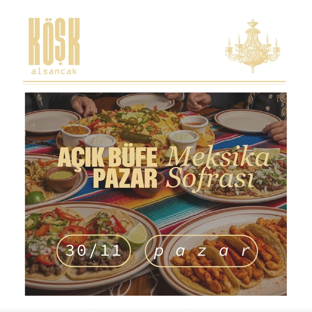 Açık Büfe Pazar: Meksika Sofrası 30 Kasım 2025, Pazar, 17:00 Köşk Alsancak Her pazar saat 17.00’de Köşk’te farklı bir ülkenin “sarı içecek sofrası” konseptiyle açık büfe keyfi seni bekliyor!Sınırsız lezzetlerin