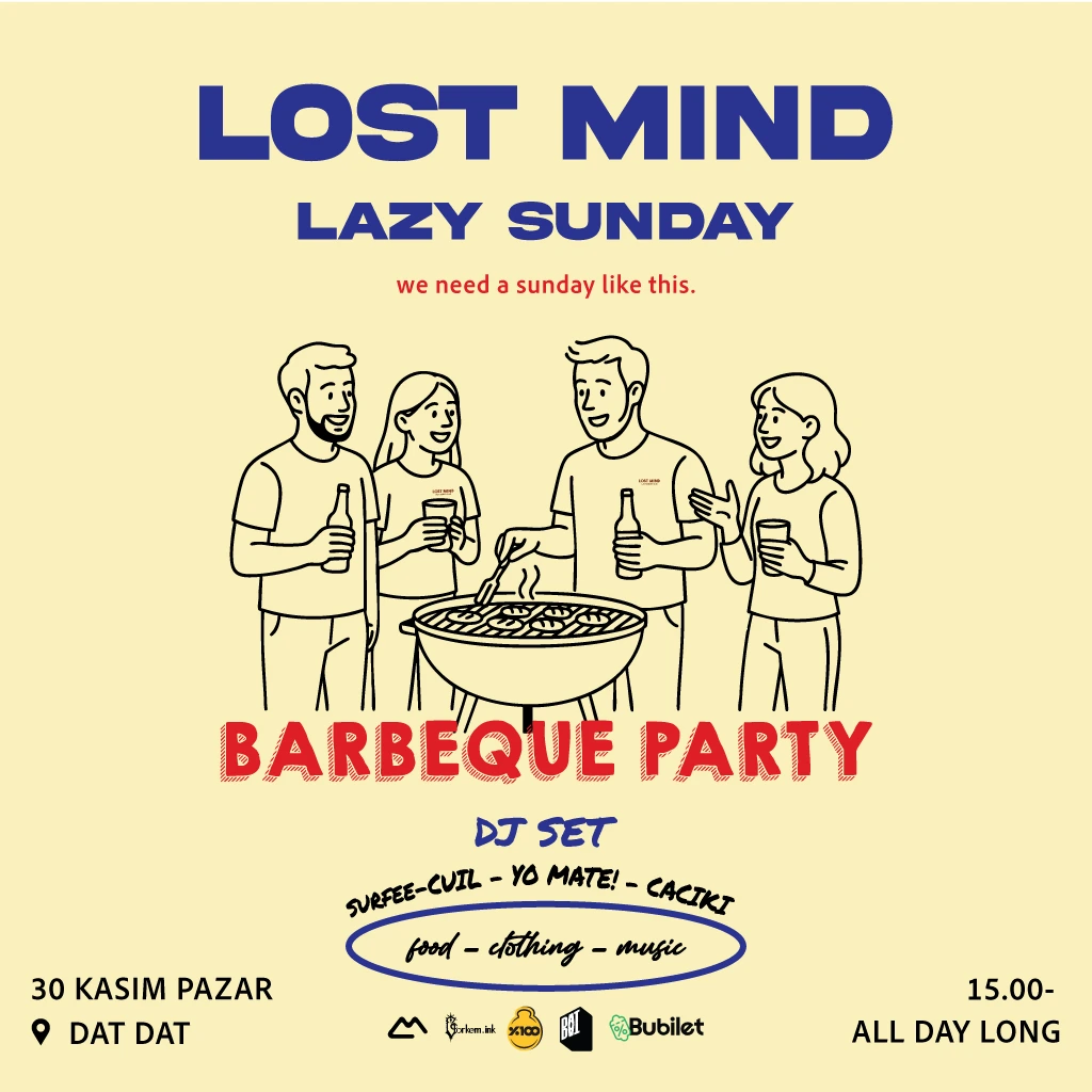 LOST MIND | LAZY SUNDAY BARBEQUE 30 Kasım 2025, Pazar, 15:00 Datdadadat Lost Mind Community DAT DAT ev sahiplinde Lazy Sunday koleksiyonu için topluluğuyla bir araya geliyor barbekü eşliğinde bolca müzik ve keyifli deneyim