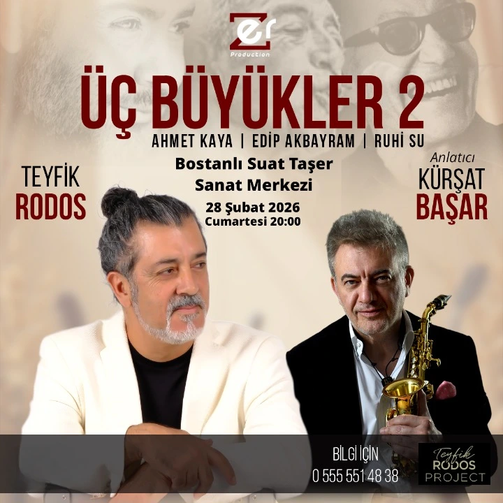 Üç Büyükler 2-Ahmet Kaya-Edip Akbayram-Ruhi Su 28 Şubat 2026, Cumartesi, 20:00 Bostanlı Suat Taşer Tiyatrosu Üç Büyükler 2 – Ahmet Kaya – Edip Akbayram – Ruhi Su etkinliği 28 Şubat’ta Bostanlı Suat