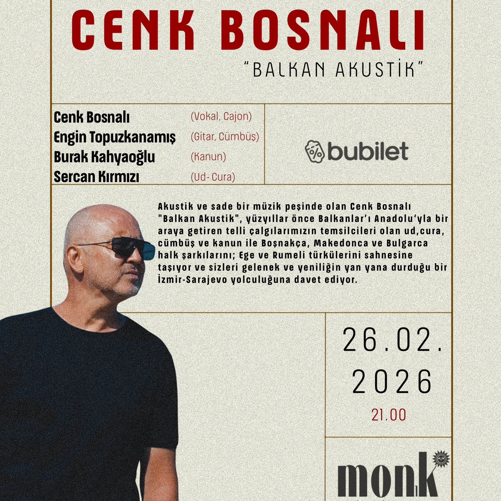 Erkan Oğur & İsmail Hakkı Demircioğlu Konseri 12 Şubat 2026, Perşembe, 20:00 AKM Yunus Emre Salonu Türk halk müziğinin en özel yorumcularından Erkan Oğur ve İsmail Hakkı Demircioğlu, akustik performanslarıyla