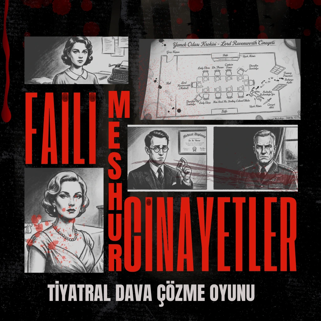 Katil Kim? Doğaçlama Polisiye 24 Nisan 2026, Cuma, 20:30 Tiyatrohane Bilinmezliklerle dolu bir oyun gecesi… Çözülememiş davaları, dedektiflik oyunlarını, doğaçlama tiyatroyu ve interaktif etkinlikler seviyorsanız