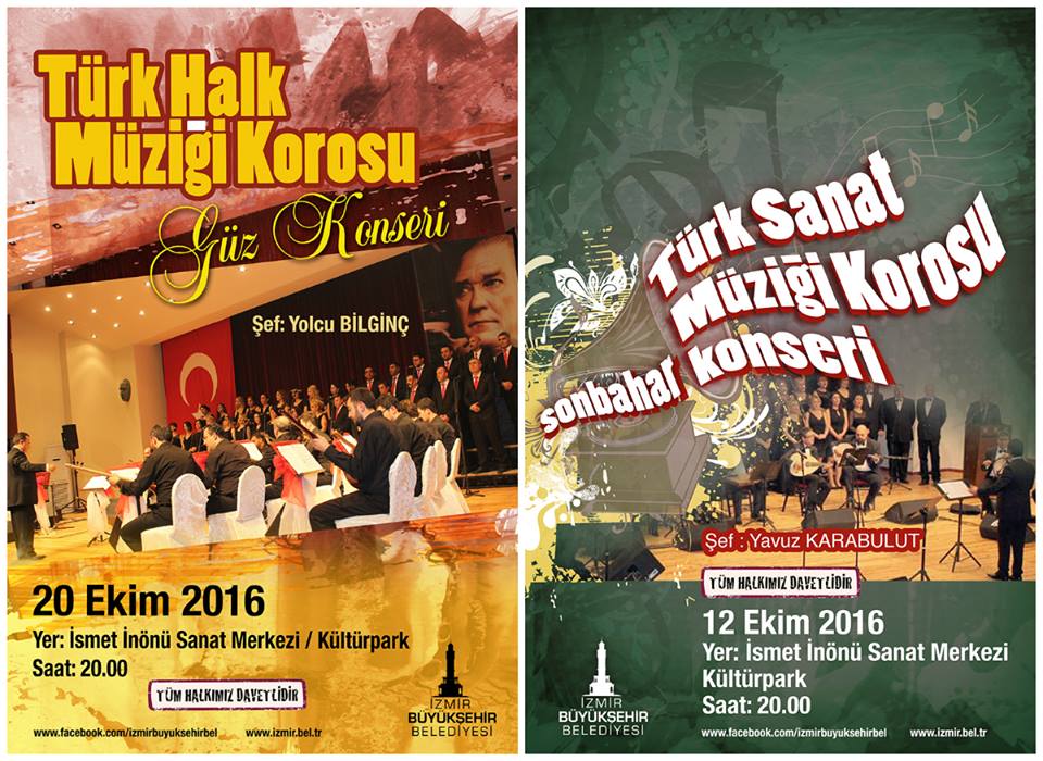 12 Ekim 2016 Çarşamba günü saat 20.00’de gerçekleşecek olan İzmir Büyükşehir Belediyesi Türk Sanat Müziği Korosu sonbahar konseri, sanat tutkunlarını bir araya getirecek. Şef Yavuz Karabulut yönetimindeki koro, Türk musikisinin seçkin eserlerini seslendirecek. İzmir Büyükşehir Belediyesi Türk Halk Müziği Korosu ise, 20 Ekim 2016 Perşembe günü saat 20.00’de Şef Yolcu Bilginç yönetiminde sahne alacak.
