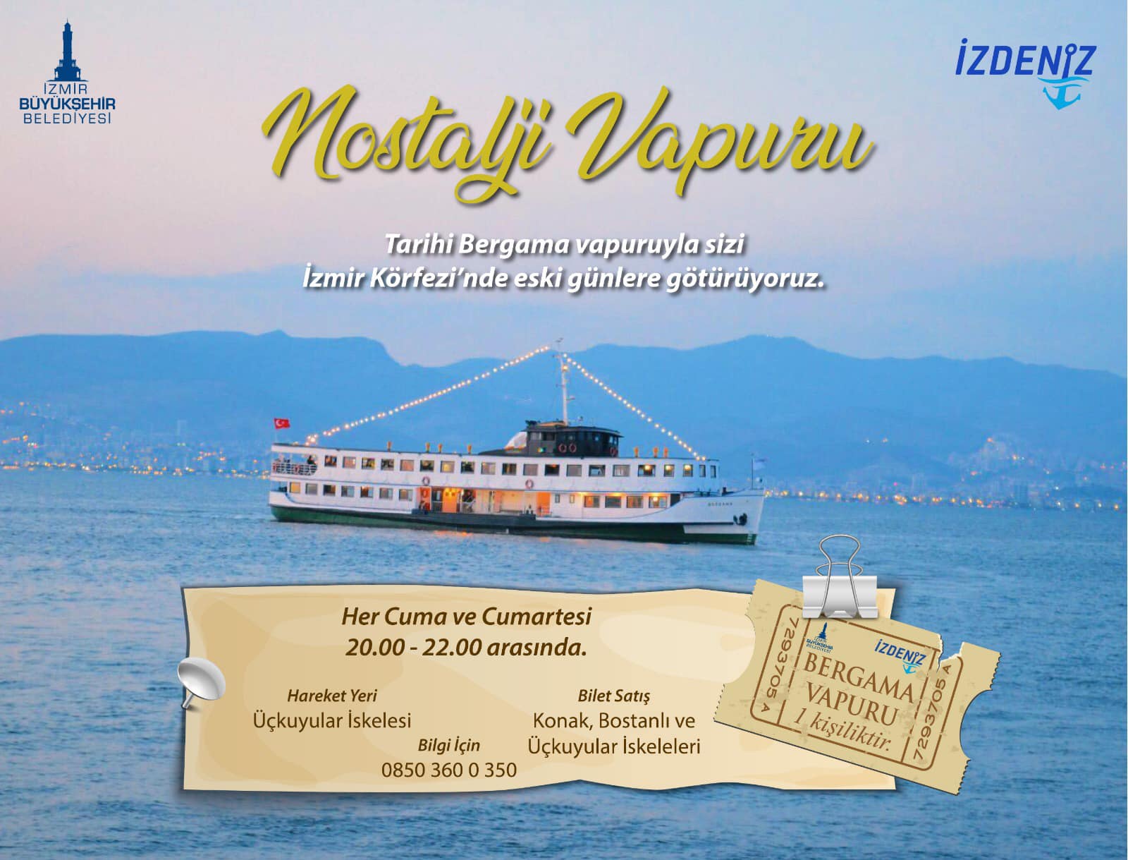 İzmir Büyükşehir Belediyesi, geçmişe özlem duyanlar için Bergama Vapuru’yla Körfez turları başlatıyor. Nostalji Vapuru adı altında, müzik dinletileri eşliğinde düzenlenecek turlara katılan İzmirliler iki saat boyunca keyifli bir Körfez turu yapacak. Üçkuyular İskelesi'nden saat 20.00'de hareket edecek Bergama Vapuru'nun özel seferi yine Üçkuyular'da son bulacak. 31 Ağustos 2019 tarihinde başlayacak seferler cuma ve cumartesi akşamları 20.00’da başlayacak ve her hafta başka bir sanatçı canlı müzik performansı sunacak. Nostalji Vapuru’nda yiyecek ve içecek satışı da olacak.