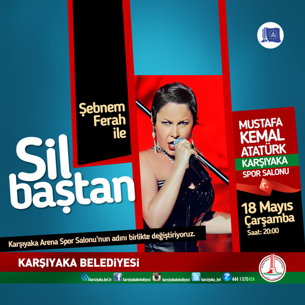 Karşıyaka Belediyesi ‘Sil Baştan’ sloganıyla Şebnem Ferah konseri eşliğinde ‘Karşıyaka Arena’ isimli spor salonunun adını değiştirerek ‘Mustafa Kemal Atatürk Spor Salonu’ yapıyor.