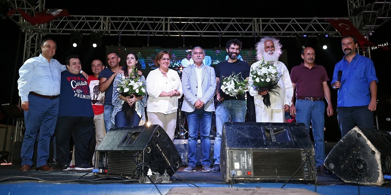 Atay’ın ardından sahneye çıkan Konak Belediye Başkanı Sema Pekdaş, bu yıl 1 Eylül Dünya Barış Günü’nde barışın ve dostluğun sesini Ege’nin iki yakasından yükseltmek istediklerini belirterek, “Biz bu coğrafyada, bu topraklarda pek çok medeniyetler kurduk, çok güzel eserler yarattık. Ama bugün savaşlar var, dramlar var. Oysa insanların savaştan kazandığı bir şey yok. Barış içinde ve özgürce gezmek hepimizin hakkı. Biz her yerde barışın sesini yükseltip, birlikte türküler, şarkılar söylemek istiyoruz. Barışın sesini yükseltelim ve savaşın acıları biran önce son bulsun diyoruz. Yaşananlara karşı susmak en büyük ayıp ve bizim susmak yerine söyleyecek çok şeyimiz var. Ege denizini mültecilerin öldüğü bir deniz yerine, barış denizi yapmak için yapacağımız çok şey var. Diktatörlüğe hayır demek için, yaşasın insan hakları demek için, yaşasın barış demek için birlikte türküler söylemeliyiz. Yaşasın barış demeliyiz” diye konuştu.
