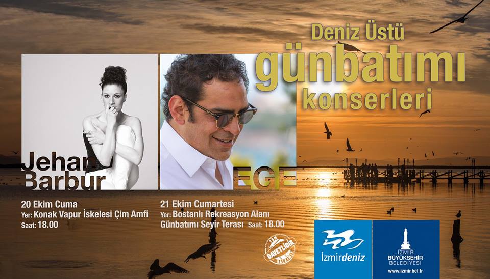 Büyükşehir Belediyesi'nin yürüttüğü İzmir Kıyı Tasarımı Projesi, deniz üstüne kurulacak platform konserleriyle taçlanacak. 20 ve 21 Ekim tarihlerinde “Günbatımı Konserleri” adıyla düzenlenen etkinliklerde Ege ile Jehan Barbur, İzmirlilere ‘denizden’ seslenecek. Yüzer platform üzerinde konser, İzmir'de ilk kez gerçekleştirilecek.