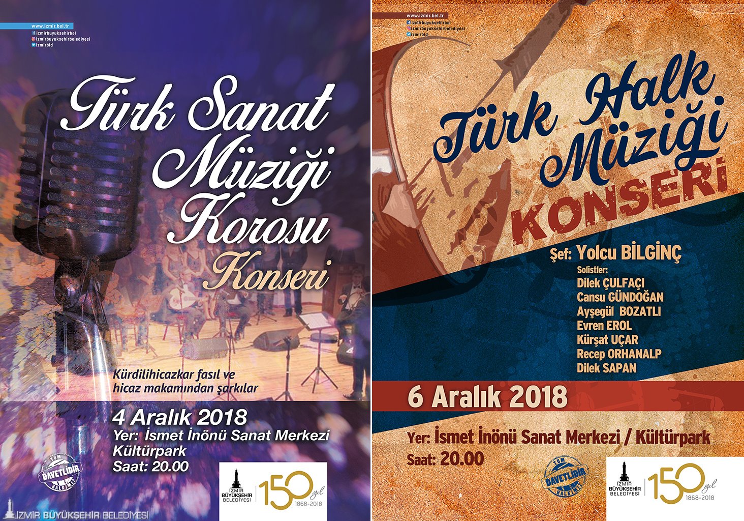 İzmir Büyükşehir Belediyesi’nin yıl boyunca gerçekleştirdiği kültür sanat etkinliklerini Aralık ayında da hız kesmeden sürdürüyor. Kendine has dinleyici kitlesiyle yıllardır büyük beğeni toplayan Büyükşehir Belediyesi Türk Sanat Müziği ile Türk Halk Müziği koroları, bu hafta peşpeşe sahne alacak. Sanat müziği ve halk müziğinin seçkin örneklerinin sunulacağı konserler halka açık ve ücretsiz olacak.