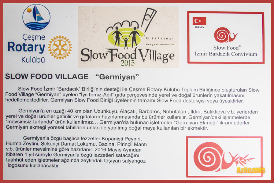 Türkiye’de Slow Food (Yavaş Gıda) hareketine katılan ilk yer olan Germiyan Köyü, Çeşme’ye bağlı bir Türkmen köyüdür. Köy konseyi ve yerel yetkililerin, İtalya ile yürüttükleri 3 yıllık sürecin ardından, Mayıs 2016 itibariyle Türkiye’nin ilk Slow Food köyü olmayı başarmışlar.