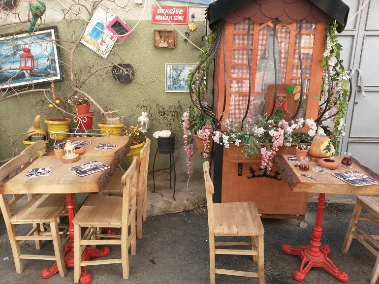 Mutfağın içinden, merdiveni kullanarak üst kata geçmek mümkün. Üst kat, ahşap sandalyeden bibloya, oyuncaktan avizeye kadar toplama objelerle döşeli. Kafede gördüğünüz her şey satılık. Tek bir şey hariç, o da kitaplar.