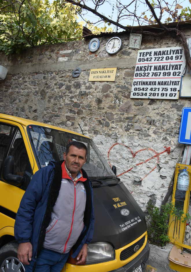 Günde yüzlerce kişinin alışveriş yaptığı tarihi Kemeraltı Çarşısı'nda kamyoneti ile nakliyecilik yapan Ömer Tepe, 864 numaralı sokağın başındaki durakta iş bekliyor. Ancak vatandaşın nakliye talebinden çok saatin kaç olduğunu sormasına kızan Tepe, sokağın duvarına herkesin görebileceği bir yere yan yana üç saat astı.